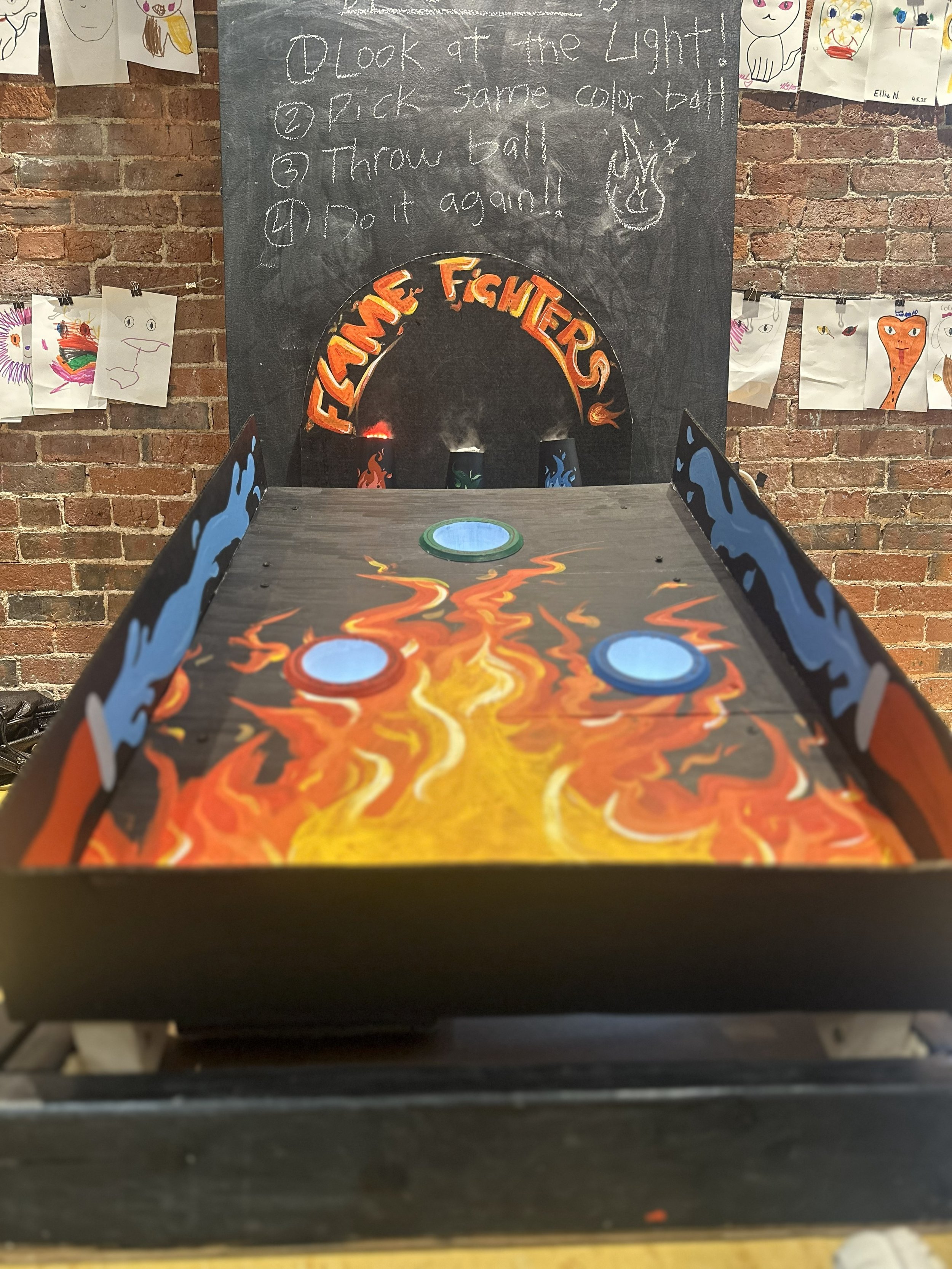 Flame Fighters is a ball-throwing game where players match color-coded "extinguisher" balls (red, green, and blue) to simulated fires represented by colored mist and LED lighting. Each color corresponds to a specific fire type: red for wood fires (water extinguisher), green for electrical fires (dry chemical/CO₂), and blue for cooking fires (wet chemical).