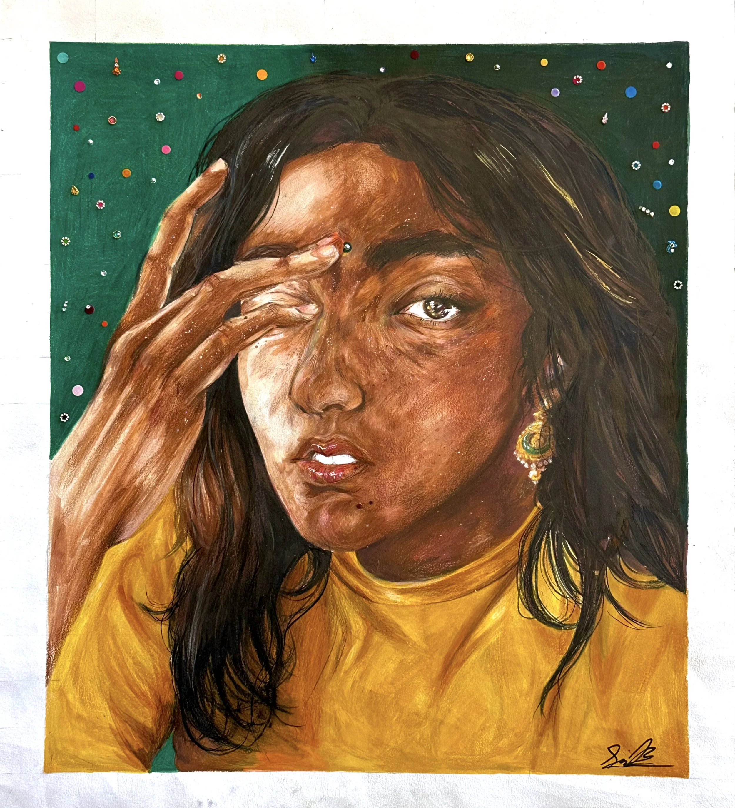 A self portrait to display the confusion of being an Indian girl born in America. Mixed Media paper with colored pencil and alcohol markers, along with physical bindis, a cultural symbol for Indian women.