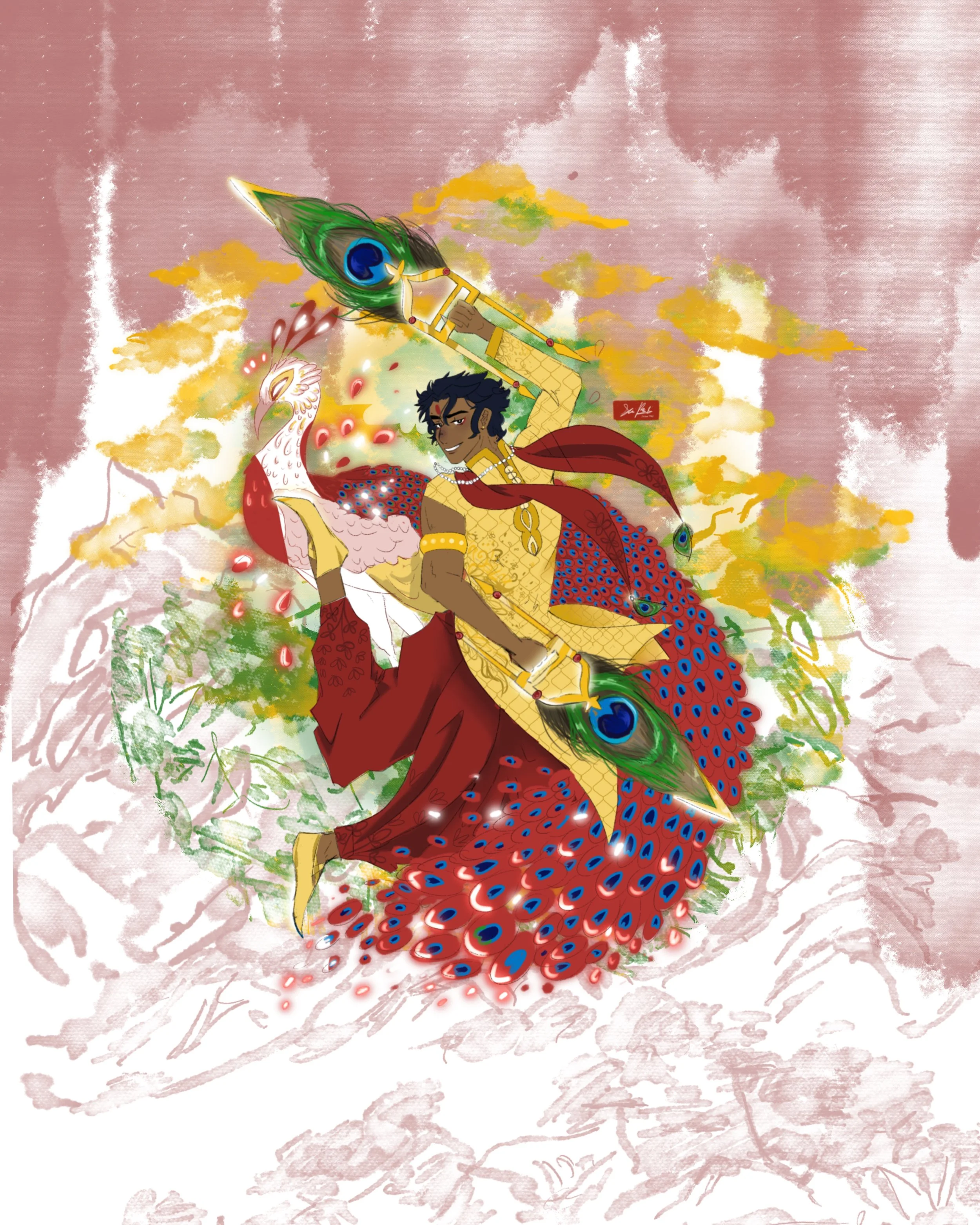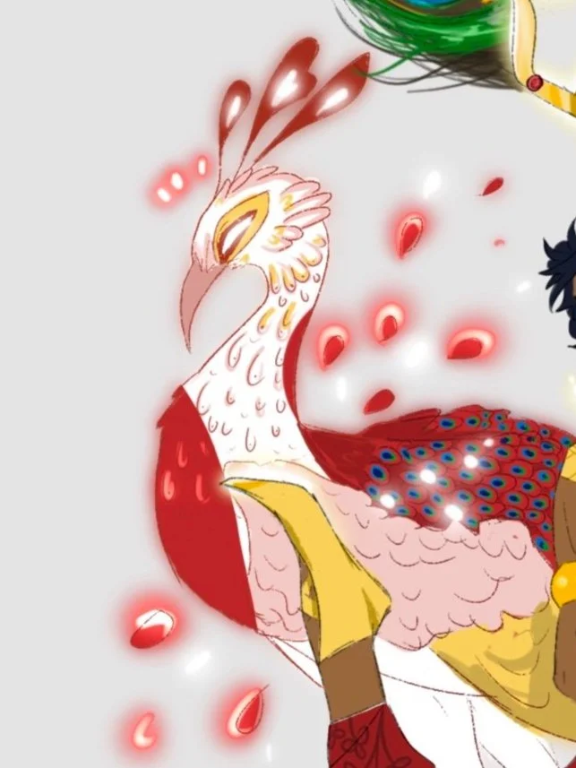 Two original characters based off of different Korean and Indian elements. Kunal is dressed in a yellow kurta and red dhoti, Don is dressed in a hanbok and a gat. Kunal is associated with a red/white peacock and a Katar (कटार), while Don is associated with a haetae and a Hwando (환도)